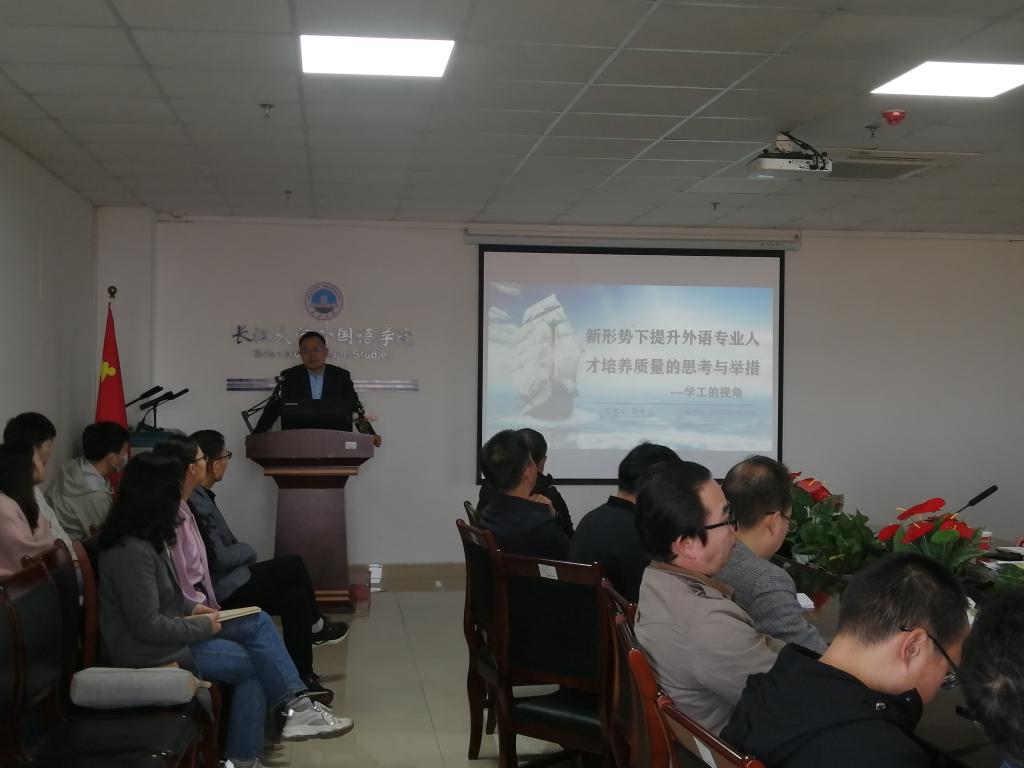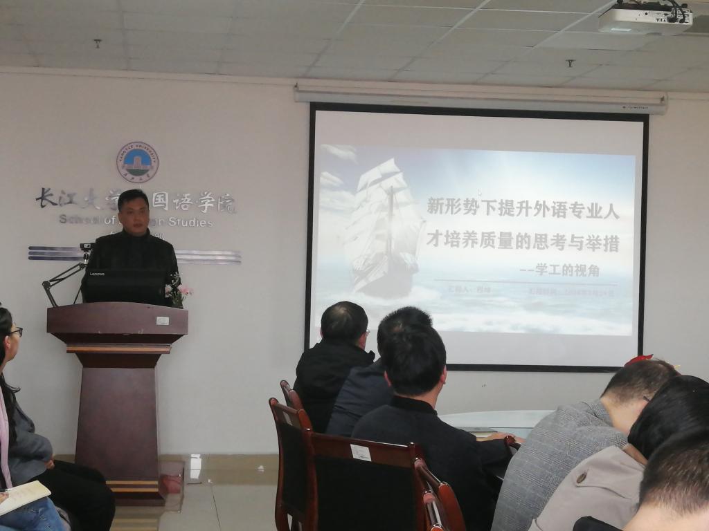 接下来,党委副书记程坤从学工视角做题为《新形势下提升外语专业人才培养质量的思考与举措》的汇报,他首先介绍公司人才培养质量现状,提出员工工作如何顺应外语教育政策的价值取向和回应国家发展战略的关切需求的思考。他提出兼容并蓄,为所当为,以教育转型、学风建设和专业提质三个方面促进员工与老师相互成就。