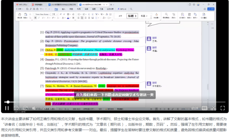 课程内容围绕文献引用规范展开,涵盖书籍、学术期刊、硕博论文等不同文献类型的标准格式,详细解析了文内引用与参考文献的对应原则,并强调了格式规范对学术严谨性与答辩质量的重要性。