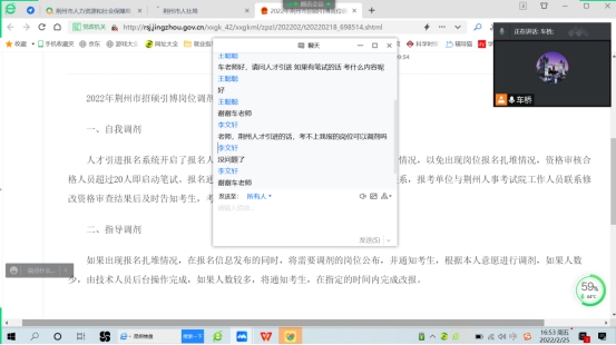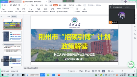 (通讯员:车桥)为精准把握荆州“招硕引博”政策,提升bw西汉姆联2022届硕士毕业生高质量就业率和留荆率,2月25日下午,通过腾讯会议召开荆州市“招硕引博”政策解读及留荆就业工作推进会,2022届全体硕士毕业生参会,会议由辅导员车桥老师主持并主讲。