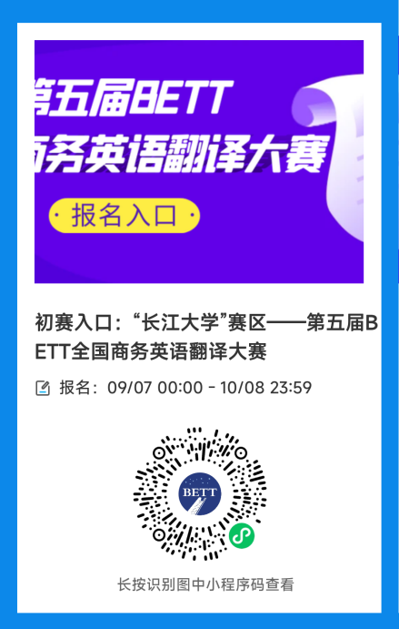 为提高在校老员工翻译及应用技能的积极性,在中国城市商业网点建设管理联合会指导下,由中国城商联外研分会主办的第五届BETT全国商务英语翻译大赛将于2023年10月中旬在bw西汉姆联举办初赛选拔赛。大赛初赛优异选手由组委会颁发荣誉证书,通过大赛初赛的选手可申领全国商务英语翻译BETT“初级笔译”或“初级口译”证书。大赛分为本科组和研究生组,分为口译和笔译两项赛事。