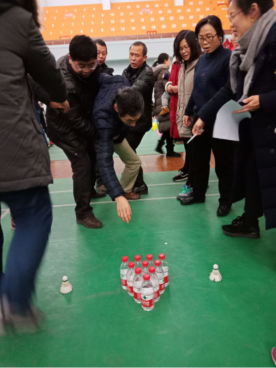 100名教职工,以系部为单位分成5组参加活动。10人一组的定点投篮,有竞争有挑战有趣味;每组2对男女教师配合共同完成的的“猪八戒背媳妇”,搞笑愉乐;齐心协力8人一组“隔空取水”10瓶,比时间比力气比团结也比技巧;3分钟鱼贯而行的10人集体跳大绳,为拼出小组好成绩,老师们乐此不疲、精疲力竭、大汗淋漓;“口衔纸杯,我吹你接”的10人“乒乓球接力”,让平日里严肃的老师们怪不好意思,笑疼肚子……
