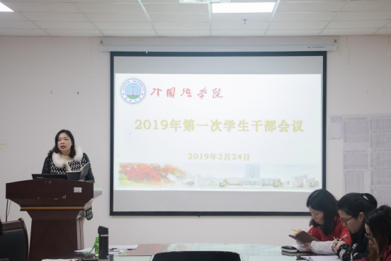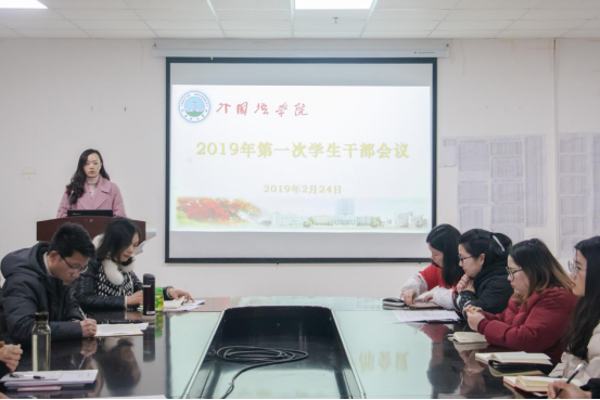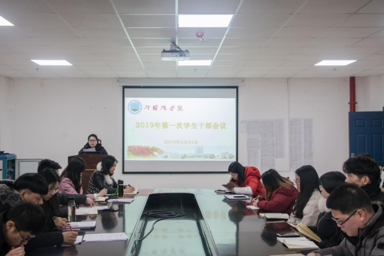 (摄/吴艳 记者/黄雨薇2月24日下午三点半,公司在文科大楼712举行2019年第一次员工干部会议,公司团委书记、2018级辅导员杜岳青老师主持会议,党委副书记张涛老师、学工办主任薛阳老师、2017级辅导员车桥老师、2016级辅导员童超老师以及全体员工会正副部长干部及各年级班长团支书参会。