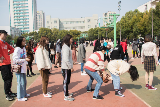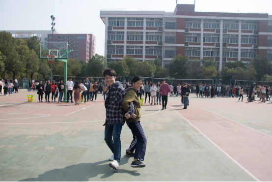 比赛场上,“举头并进”火热进行时,选手们各出奇招,大部分采取小碎步式前进,其中一位男同学独创的“鸭子型”姿势让同学们忍俊不禁;“摇曳前行”激烈角逐中,选手们小心翼翼,在空地上走出一个S形绕过障碍物;“篮球接力”选手们有的弯腰,有的抬手,相互配合接力传球;“齐心协力”团结协作时,男生和女生背靠背夹住气球穿越篮球场,直至运送完5个气球到终点。整个游戏过程有条不紊,充满激情和欢乐。