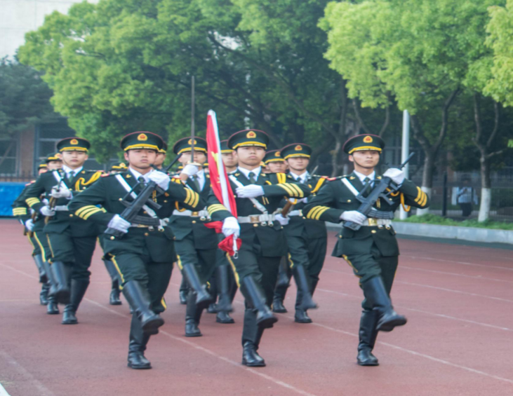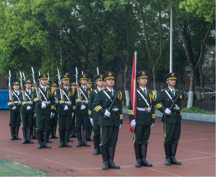 国旗护卫队迈着矫健的步伐走向升旗台,伴着庄严嘹亮的国歌,五星红旗冉冉升起,全体师生怀着崇敬与喜悦的心情,凝视着迎风飘扬的五星红旗,心中无比自豪。