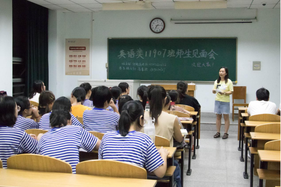 见面会伊始的自我介绍环节,教室里便此起彼伏地充斥着热烈的掌声。同学们第一次站上大学教室的讲台上,在黑板上书写下自己的名字,彰显着各位新生们已经在自己老员工活的起点上留下了浓墨重彩的一笔。紧接着,他们又用精彩的自我介绍让其他同学认识自己。他们不仅介绍了自己的家乡、兴趣爱好等,有的同学甚至讲到了自己的外号,以新奇而有趣的方式让其他同学了解了自己;有的同学说自己喜欢哆啦A梦,因此身材也向着它发展……精彩纷呈的介绍让整个见面会轻松而活跃。其中,英语类六班的老师则给同学们提出了一个小规则,让本就精彩的自我介绍更加别开生面。老师要求同学们在介绍自己前,先回忆一遍在自己前面做自我介绍的同学的名字,说说自己的前后左右是谁,然后再用家乡话进行自我介绍。于是大家听到了来自湖北、山东、广东、江苏、天津等各个地方的同学们所讲的方言,在感受到地域文化差异的同时,也感受到了大学的丰富多彩。
