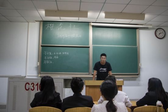 面试工作有条不紊的开展中,参加竞选的同学们都在下面做好,准备上台展示自己。本次招新面试均采用自主上台的形式,同学们跃跃欲试,轮流上台,上台的同学先把自己的名字写在黑板上,标明自己想加入的部门和组别,然后进行2至3分钟的自我介绍并回答评委的问题。有的同学充满自信,昂首挺胸的走向讲台,开始自己的讲述;有的同学略显紧张,腼腆的进行自我介绍。部长和副部们在下面传看新成员的报名表,基本把握部门成员的信息,并认真做笔记。