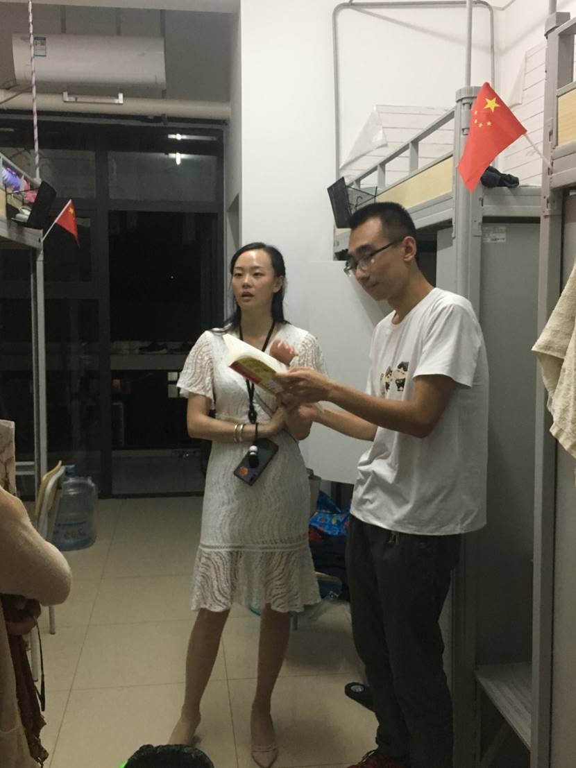 国庆佳节将至,为了提高同学们的安全防范意识,2019年9月27日晚21点,公司分团委书记杜岳青老师和研究生员工会干部应婷,颜倩等人一起走访了员工宿舍,就同学们的学习生活情况进行了解和交谈,并嘱咐大家注意假期安全。