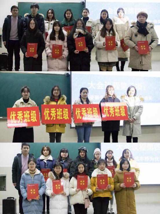 随后车桥老师作总结报告,他首先对上学期专业四级考试情况进行通报,对比员工考前的志向与考后的结果,比较差距。其次对2018-2019学年度回顾与总结,克服不足,发扬优点。并对关键问题进行提醒,严禁替考。回顾挂科情况,以及荣誉情况,表彰优秀员工干部。除了上学期的回顾,他还对本学期课堂考勤情况进行通报,对比各班级请假、迟到、旷到的情况。根据一学期的实际情况他指出日常管理中存在的问题,告诫同学们严禁在宿舍养宠物,并提醒同学们在冬天要高度重视宿舍的用电安全以及在期末之际要做好复习,诚信应考。在大会结束之际车老师对下学期的工作进行了安排与解读,对考研就业以及出国的同学分别提出了不同的建议,希望同学们在下学期做好自身的规划,栉风沐雨,砥砺前行。