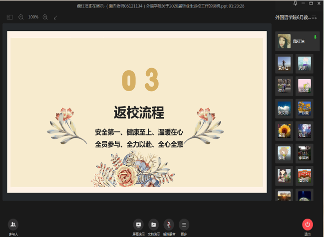 党委副书记魏红洁向大家详细讲解了《2020届毕业生返校工作方案》。据统计,自6月15日至30日,公司共有318名毕业生获得批准返校。为热情、周到、安全、有序做好公司毕业生返校相关工作,公司成立了毕业生返校办理毕业手续工作领导小组,由公司党委书记和经理担任组长;制定了详细的毕业生返校流程,每一名毕业生返校都安排有联系人,联系人均由公司教师和员工志愿者担任。魏红洁副书记号召全院教职工积极主动参与到毕业生返校工作中来,让员工高兴而来,满意而归。
