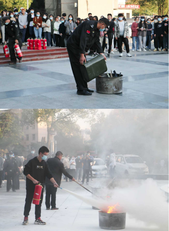 最后,周开杰讲师演示了灭火器的使用方法,着重强调了使用灭火器的具体操作步骤和注意事项,并让同学们亲自体验灭火的过程。同学们在学会灭火器的操作方法后,都积极踊跃地报名参与到灭火体验活动中,现场的气氛十分活跃。