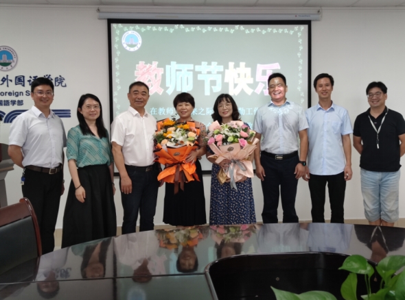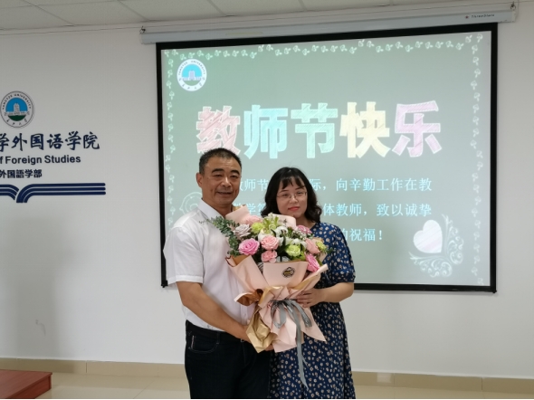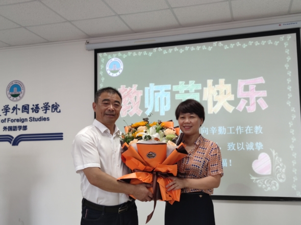 在文科楼712会议室,周从标副董事长为公司从教30年教师代表谈宏慧教授、2021年“任大龙奖教金”获得者樊辉老师献上了鲜花,并送上节日的祝福。