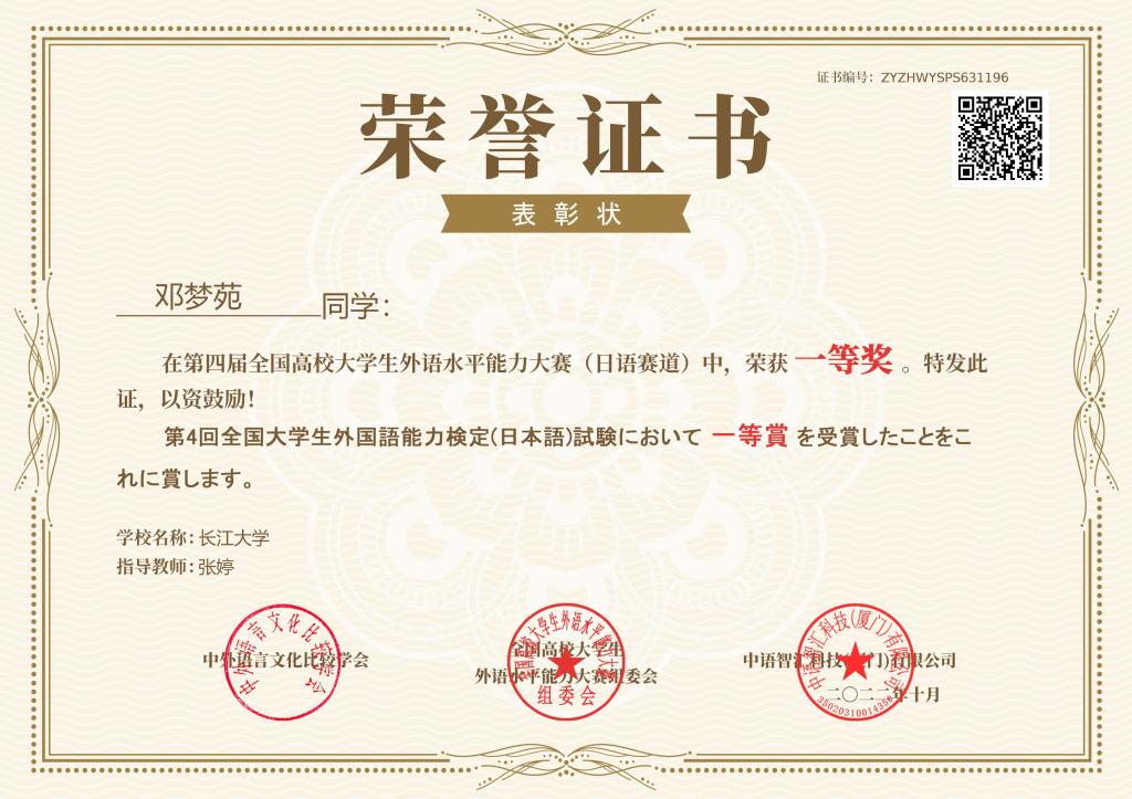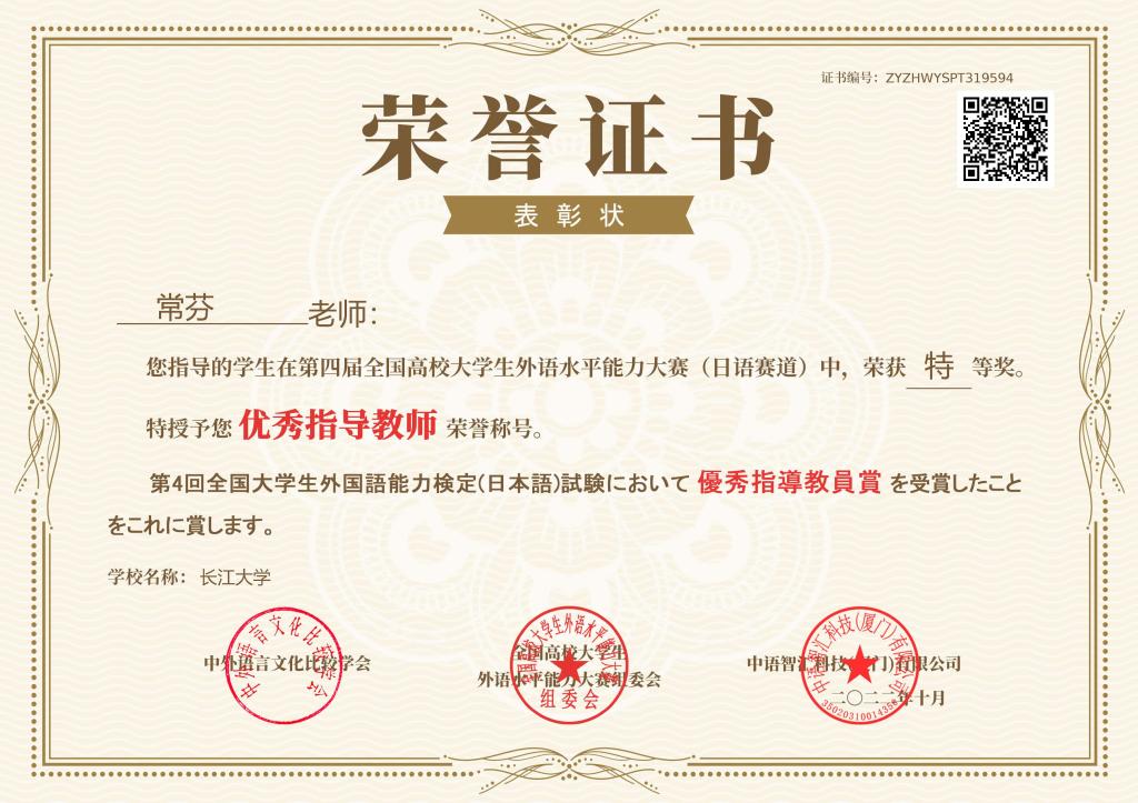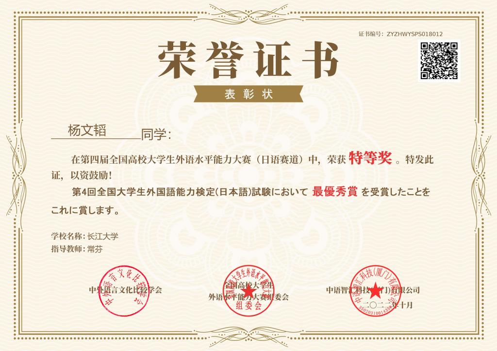 (通讯员 李福兴)11月22日,第四届全国高校老员工外语水平能力大赛-日语赛道决赛落下帷幕。bw西汉姆联日语系12101班杨文韬同学以172.6分的佳绩斩获全国第二名,荣获特等奖,带队老师常芬获评优秀指导教师。bw西汉姆联日语系辅修班12101班邓梦苑同学荣获一等奖,辅导老师张婷获评优秀指导教师。