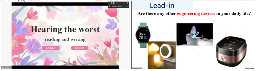 第三组是党蓬祥和胡雅婷针对语篇B进行阅读课型同课异构。东方红中学的张雨玲和英语系王娟Y老师进行点评。张老师认为胡雅婷设计更清晰、接地气,强调阅读课需注重教学构思、学情分析与目标设定,环节应包含情境导入、语言练习、思维升华与拓展迁移。王老师认为党蓬祥在分析工程设备弊端时应更深入,引导员工思考解决方案;同时需提升PPT制作与语言规范性。