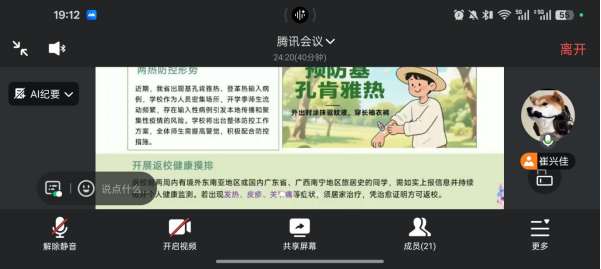 在健康管理方面,班级负责人向同学们传达当前“两热”防控形势,布置返校前后健康摸排工作,同时介绍“美丽长大——我们在行动”、“文明宿舍创建”等第二课堂活动内容,引导员工做好宿舍卫生与健康防护。
