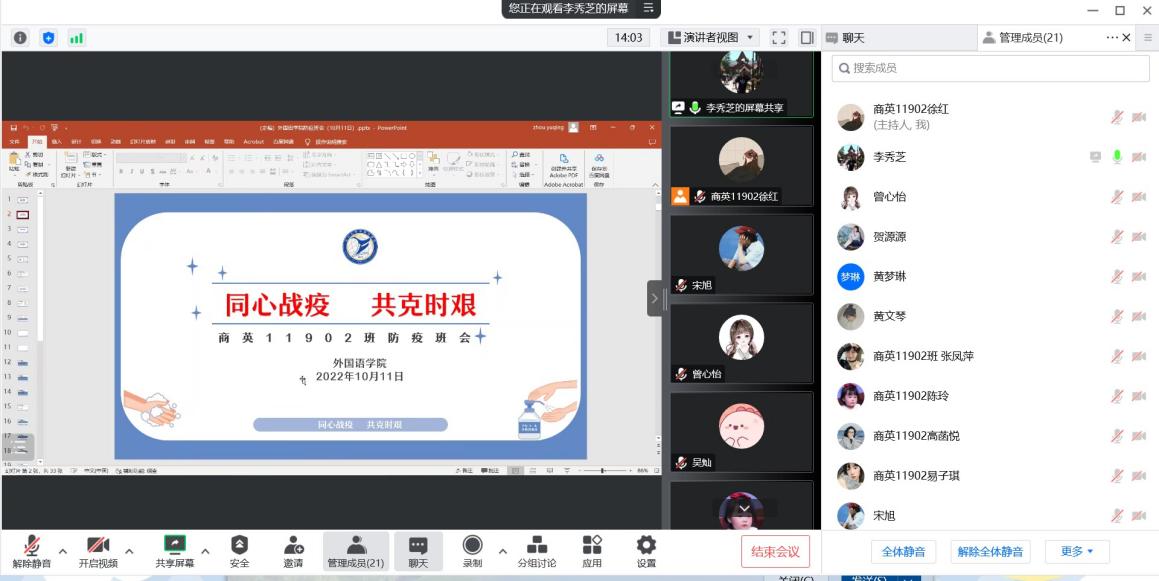 为打赢校园防疫保卫战,更好地做好员工疫情防控工作,10月11日,全院本科生班级和研究生小组在线上召开了疫情防控专题班(组)会,会议由班主任和导师主持和主讲。