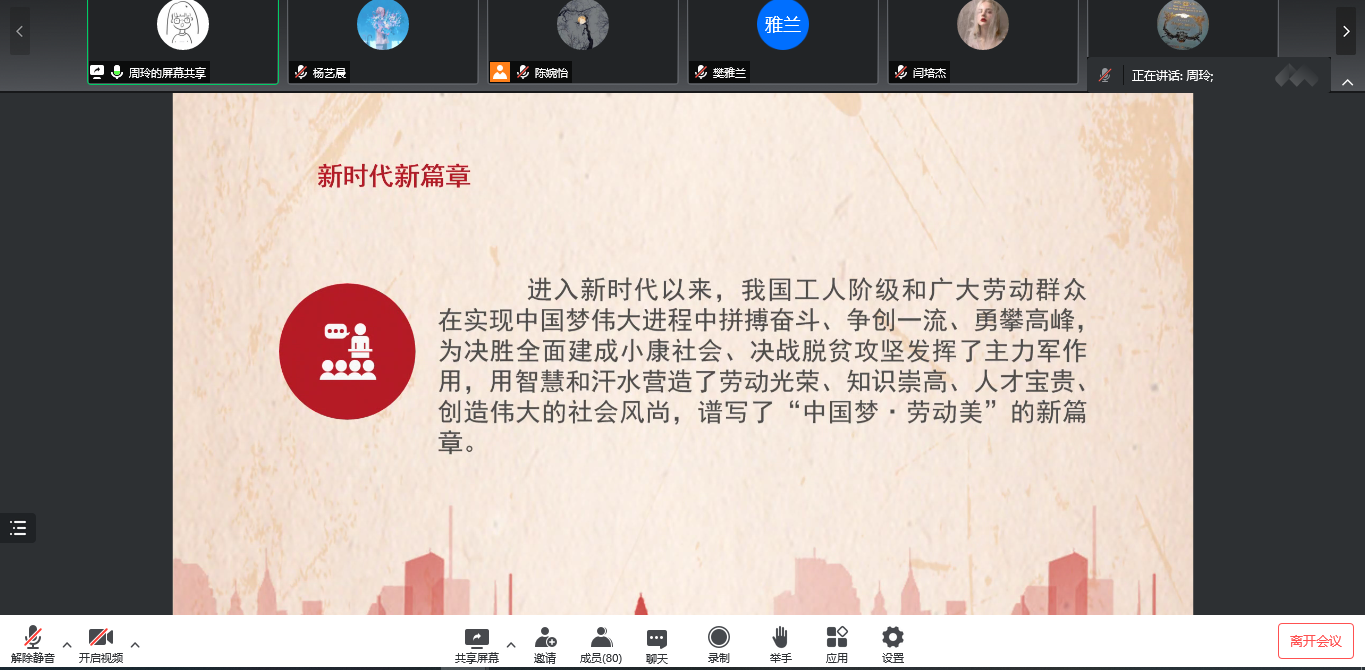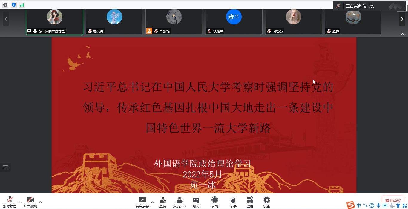 会议伊始,21级英语笔译苑一冰同学介绍了习近平在中国人民大学考察时的讲话,激励大家求真务实,做勇担民族复兴重任的时代新人。随后,21级学科英语潘怡西同学汇报学习了习近平在中共中央政治局常务委员会会议上的讲话,呼吁同学们团结一心,配合公司防疫工作。20级学科英语龙晨同学介绍了习近平总书记的两封回信以及两封贺信,强调广大青年要奋发进取,投身建功新时代。20级英语笔译刘雅琴同学以及21级外应吴丽同学共同带领大家学习了习近平在庆祝中国共产主义青年团成立100周年大会上的讲话,呼吁大家认真学习领悟习近平总书记重要讲话精神,为实现中华民族伟大复兴中国梦而不懈奋斗。最后,20级外应周玲同学介绍了“劳模精神”——中国共产党人的精神谱系之十九,希望大家增强创新意识,刻苦钻研,用奋斗书写最美青春。