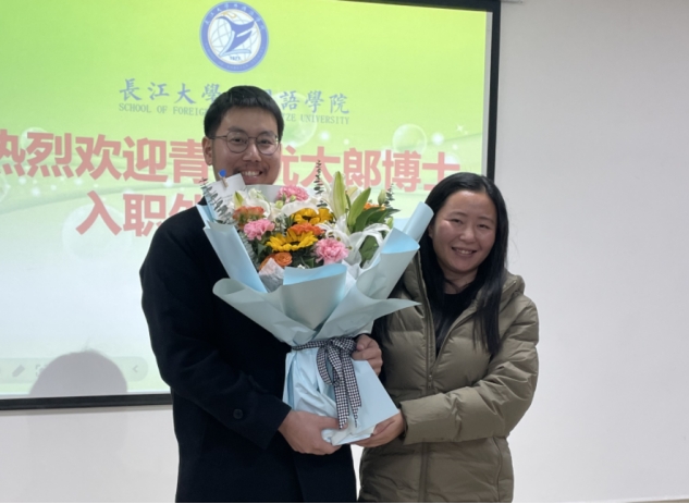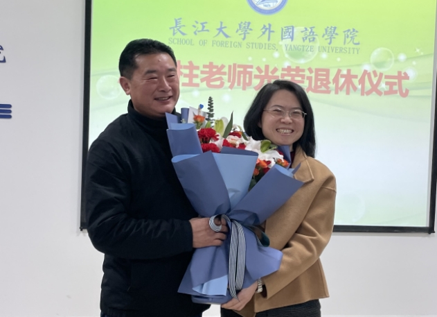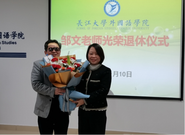 经理谈宏慧、副经理付小秋、日语系教师常芬分别为邹文老师、汪邦柱老师、青山优太郎博士献上了美丽的鲜花。