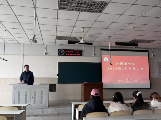 作为专业学习爬坡期,2024级大会以专业四级备考、学风提升、竞赛实践为核心。年级辅导员童超对上学期成绩进行全面复盘,通报各班级绩点、挂科情况,明确商英、英语师范、日语专业分层备考目标。三位员工代表分享班级寒假专四复习经验,公司公布三次全年级模拟考试安排,以考促学、压实备考责任。同时梳理“外研社·国才杯”、全国老员工英语竞赛等赛事节点,鼓励员工以赛促学,提升专业核心能力。恰逢“三八”国际妇女节,大会融入女性心理健康互动环节,传递人文关怀。