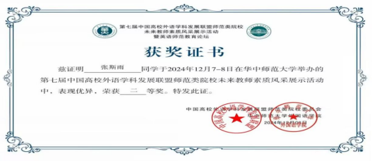(通讯员 张斯雨)为全面提升师范类院校员工英语教学技能和教学水平,推动未来卓越英语教师综合素养的培养,发挥职前教师教育的引领示范作用,由中国高校外语学科发展联盟主办,华中师范大学承办的“第七届中国高校外语学科发展联盟师范类院校未来教师素质风采展示活动”,于12月8日成功落下帷幕。在此次盛会中,bw西汉姆联鲁志荣老师悉心指导的22级员工张斯雨同学荣获二等奖、肖贻之同学荣获优秀奖,展现了公司学子的卓越风采。