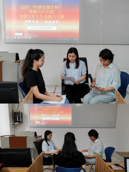 经多轮筛选,6名口译选手与25名笔译选手入围决赛。当日14:00,口译决赛在文科楼106开赛,付卉、陈双玉任评委,选手依现场中英文音频完成主旨及会议口译,展现扎实专业能力;同期,笔译决赛在文科楼208启动,李泽娟任评委,选手专注译写、精准传译文化内涵。