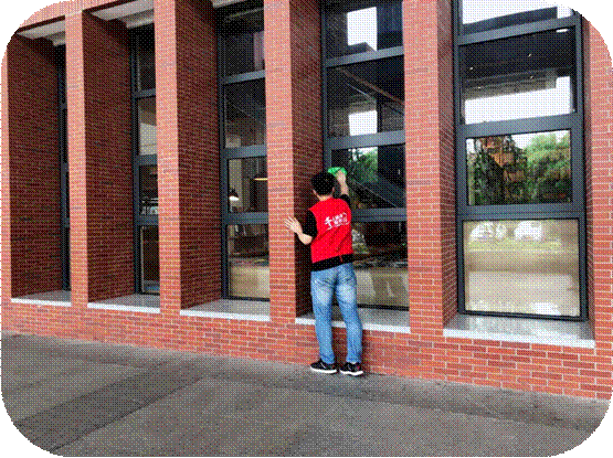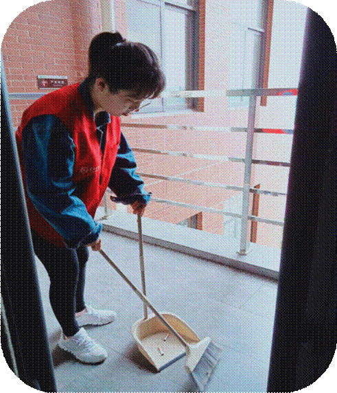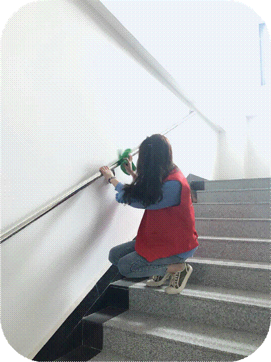 活动伊始,志愿者们集体从文科大楼一楼开始清扫,路上来来往往的是行人,而让人眼前一亮的是外院的“红色小分队”,也就是外院的志愿者们,他们全心全意的投入到清扫活动中,不放过地上的一片纸屑,玻璃上的一丝灰尘。尽心尽力的在为校园清洁贡献自己的绵薄之力。爱创自强社的成员带着志愿者们熟悉环境后,便进行了明确分工,将志愿者们分成两组,一组由顶楼开始打扫,另一组则从二楼开始清扫,最后在七楼集合。
