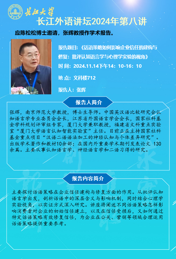 长江外语讲坛2024年第八讲:话语策略如何影响企业信任的建构与修复:批评认知语言学与心理学实验的视角