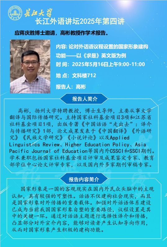 长江外语讲坛2025年第四讲:论对外话语议程设置的国家形象建构功能—以《求是》英文版为例