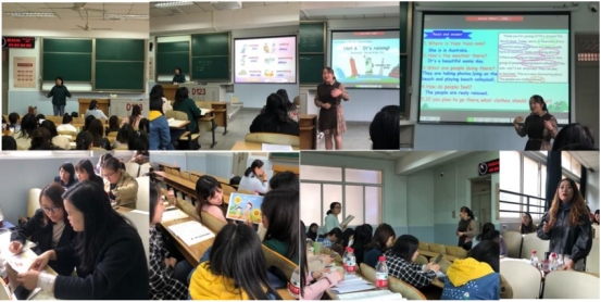 精彩的课堂继续上演,接下来国培学员杨秋芳老师和曹忠慧老师又给了我们带来了两顿不一样的盛宴。杨秋芳老师呈现的是一堂听说课,内容是人教版(Go for it! )七年级下册Unit 7 It’s raining! 册第一课时i( 1a -2b),课堂上的杨老师犹如一只正在周游世界的小鸟,带领着大家从国外的城市,飞到国内的各个城市,了解和谈论不同地方的天气,课堂有唱、有跳,还有妙趣横生的小短片,极大地激发了下面“员工”的积极性和表现欲,认真听讲,主动思考,乐于表达! 课后,杨老师也说,太感谢我们bw西汉姆联的老师了,正是他们的耐心点拨和不断细心打磨,才有了我现在自我满意的表现,我真是迫不及待想把这样的课堂带回家了!