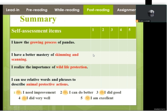 本次磨课聚焦于教学设计介绍与分析。王菲同学首先介绍自己的教学设计,她基于英语教学活动观,设计了不同思维层次的英语教学活动。她的教学设计逻辑严密、环环相扣,充分体现了对教材的深入理解与把握。并在教学过程中,把立德树人落实在教学环节,德育与学科教育的有机结合。