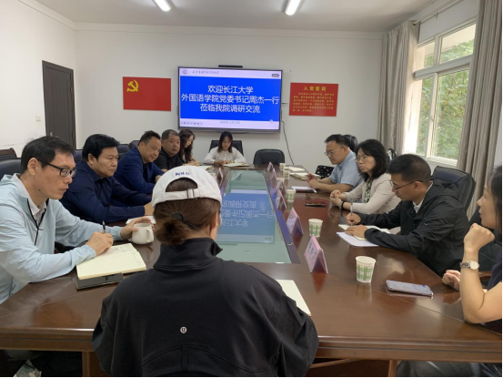 (通讯员 王娟)为深化校地教育合作,共促荆州外语教育高质量发展,10月10日上午,外国语公司党委书记周杰带队,副经理付小秋、徐芳、蒋庆胜,英语系主任王娟,学科英语主任张晓莉一行6人,专程赴荆州市教育科学研究院(以下简称“教科院”)开展交流。荆州市教科院经理王佑军、副经理张辛夫、胡家权,主任陈勇,以及小初高三学段英语教研员刘江盼、聂宇涓、陈媛媛热情接待了周杰书记一行,双方围绕外语公司产品合作、团队培养、科研攻关等议题展开深入探讨,达成多项共识。会议由张辛夫副经理主持。